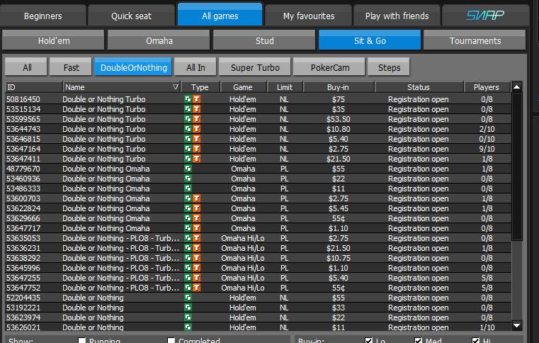 Open the Sit & Go tab from the 888 Poker lobby, check the new DoubleOrNothing tab and buy into a Double or Nothing tournament for as little as $2.50 + 35¢